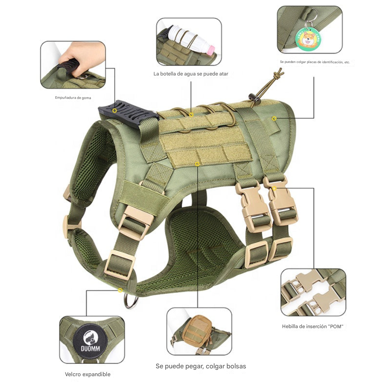 El Arnés Táctico "GuardPro" está diseñado para ofrecer la máxima protección, comodidad y control durante actividades al aire libre. Este arnés de alta resistencia, inspirado en equipamiento táctico, es ideal para perros medianos y grandes que necesitan un soporte robusto para caminatas, entrenamientos o misiones especiales. Fabricado con materiales duraderos y acolchados, el "GuardPro" garantiza comodidad y evita rozaduras en la piel de tu mascota. Sus múltiples puntos de ajuste y cierres de seguridad proporcionan un ajuste perfecto y seguro, mientras que su diseño permite una distribución uniforme del peso, evitando tensiones en el cuello y la espalda del perro. El "GuardPro" también cuenta con un sistema MOLLE (modular lightweight load-carrying equipment), permitiendo añadir accesorios o bolsillos adicionales para adaptarse a las necesidades específicas de cada aventura. ¡Lleva la seguridad y el estilo de tu perro al siguiente nivel con el Arnés Táctico "GuardPro"! Ideal para aquellos que buscan resistencia y versatilidad en cada paseo o misión.