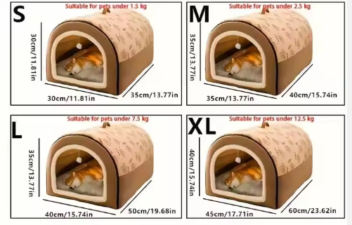 La casita está disponible en varias tallas (S, M, L, XL) para adaptarse a diferentes pesos y tamaños. Te recomendamos revisar la tabla de medidas y peso recomendado para asegurarte de que tu mascota tenga suficiente espacio para estirarse cómodamente.