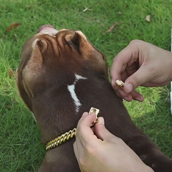 “Presentamos el Collar de Lujo ‘Golden Paws’, un accesorio diseñado para quienes buscan destacar con elegancia y sofisticación. Este espectacular collar, fabricado con acero inoxidable bañado en oro, es perfecto para darle a tu mascota un toque de distinción y glamour en cada ocasión. Su diseño robusto y a la vez refinado no solo resalta por su belleza, sino también por su durabilidad. Equipado con un cierre seguro y resistente, el ‘Golden Paws’ ofrece una sujeción firme, ideal para perros de todas las razas y tamaños que saben cómo llevar el lujo con estilo. Además, su acabado pulido garantiza un brillo que no pasará desapercibido. ¡Haz que tu compañero de cuatro patas sea el centro de todas las miradas con el Collar de Lujo ‘Golden Paws’! Perfecto para eventos especiales o simplemente para pasear con clase, este collar combina funcionalidad y sofisticación, haciendo de cada paseo una experiencia verdaderamente única. ¡Porque tu mascota merece lo mejor!