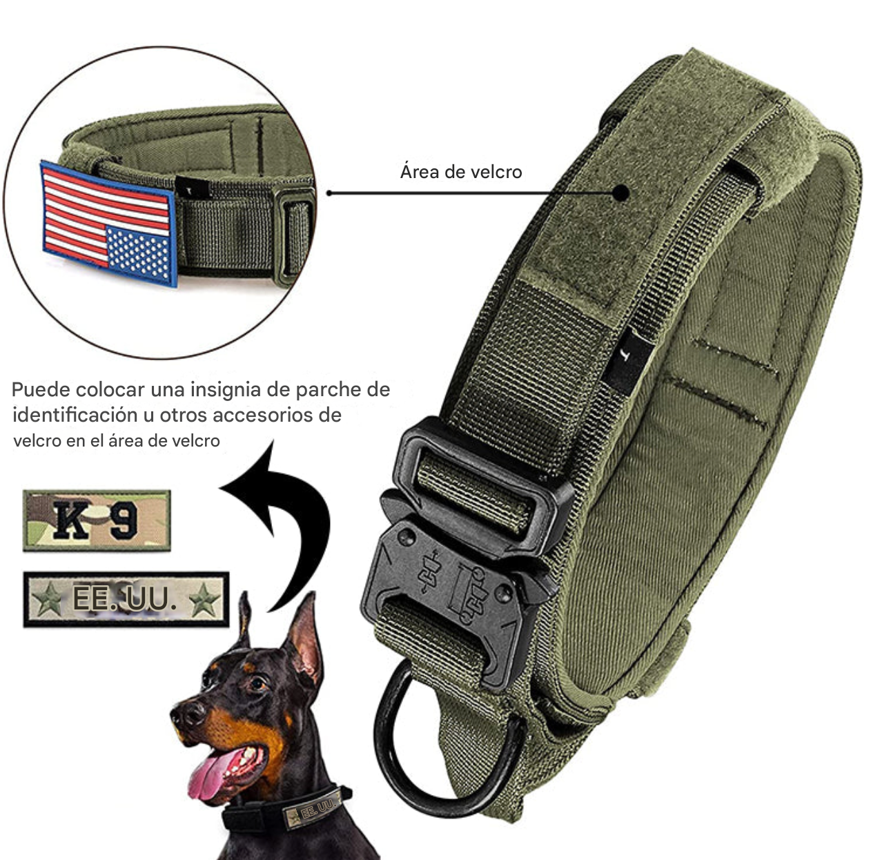 Fabricado con materiales de grado militar, el Collar TacticalPro cuenta con un cierre metálico de alta resistencia y un sistema de ajuste fácil que garantiza la seguridad y el confort de tu mascota en cualquier situación. Su diseño ancho y acolchado protege el cuello de tu perro, distribuyendo la presión de manera uniforme para evitar lesiones durante los paseos o entrenamientos.