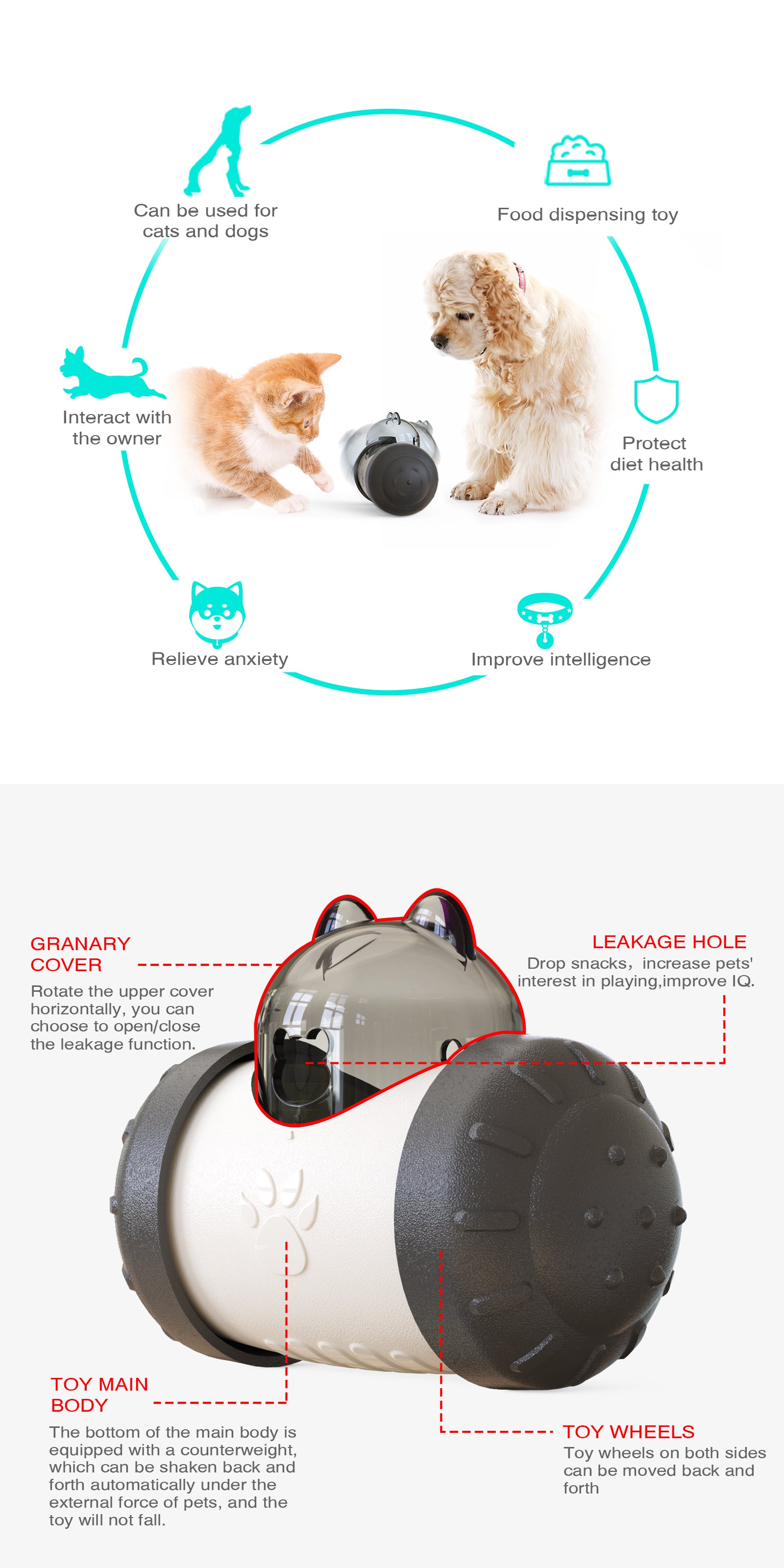 El ""KittySpin"" cuenta con una base giratoria que se mueve al ser empujada- y una cuerda con bolas colgantes que se balancean de manera atractiva- invitando a tu mascota a golpear- atrapar y jugar. Además- su diseño oscilante permite rellenar la parte inferior con golosinas- recompensando a tu gato cada vez que interactúa con el juguete- manteniéndolo comprometido y feliz.