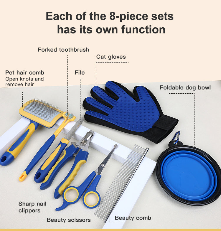 El ""PetCare Deluxe"" incluye un peine de deslanado para eliminar el pelo suelto- tijeras de corte para dar forma y eliminar nudos- un cortaúñas de seguridad- un cepillo suave para el cuidado diario- un guante de aseo para masajear y recoger el pelo- y un cuenco plegable para agua o comida. Además- viene con un cepillo de dientes especial para mascotas- asegurando una limpieza completa y profunda.